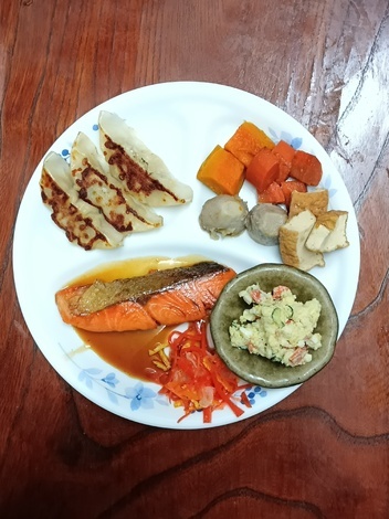 銀鮭の和風焼き、餃子、南瓜・厚揚げ・人参・里芋煮、サラダ、酢の物