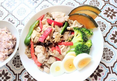 豚肉、舞茸、ピーマン、パプリカの塩麹炒め
