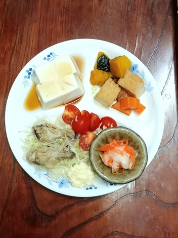 手羽元煮、冷奴、南瓜・人参・厚揚げ煮、サラダ、酢の物