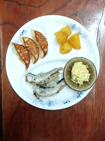 鰯の酢漬け、餃子、じゃが芋煮、サラダ