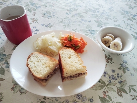 いわしの缶詰のサンドイッチ、茹でキャベツ、人参の酢の物、バナナを食べました。