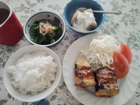 ごはん、ナスのはさみ揚げ、茹で小松菜、バナナヨーグルトを食べました。