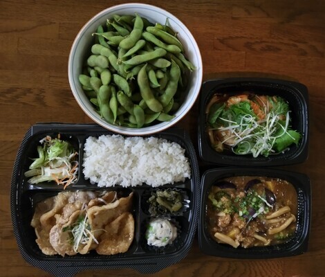 生姜焼き弁当、茄子とキノコのひき肉味噌炒めなどを食べました