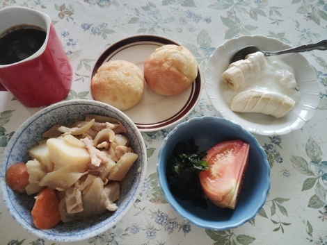 プチフランス、肉じゃが、トマトとわかめのサラダ、バナナヨーグルトを食べました。