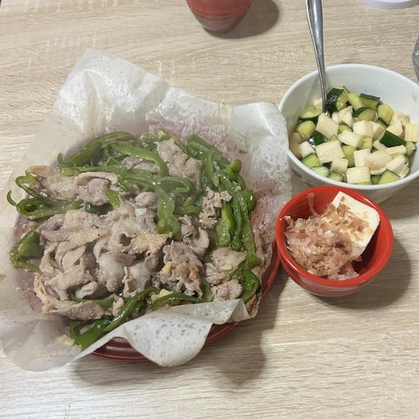 大麦古古米、豚肉とピーマンのにんにく塩麹炒め、長芋ときゅうりの無限ポリポリ、冷奴
