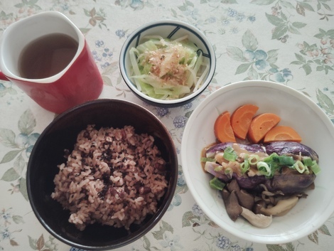 小豆ごはん、なすドッグ、茹でキャベツを食べました。
