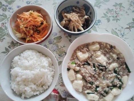 ごはん、塩麻婆豆腐、人参とキャベツの酢の物、茹でキノコを食べました。