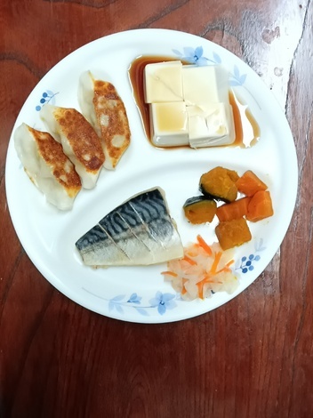 塩鯖茹で、餃子、冷奴、南瓜・人参煮、酢の物