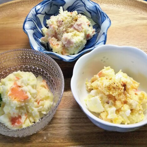 前日の晩ごはんは、鮭の唐揚げとポテトサラダを3種類。ハム入りは、レインボーペッパーを振って、ハム+ゆで卵入りは、チリパウダーを振りました。