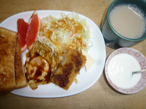 ■今日のおうちごはんは何?写真があればぜひシェアしてね!グレープフルーツ、サラダ、チーズ、魚フライ、目玉焼き、トースト、ヨーグルト、豆乳ティー
