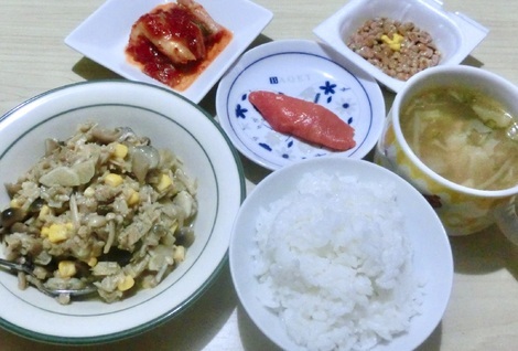 ご飯、しめじエノキコーンのニンニクバター炒め、