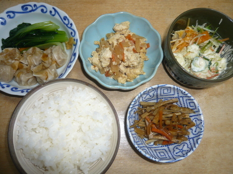 焼売、金平ごぼう、炒り豆腐、ポテトサラダ、ご飯