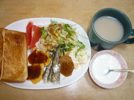 フルーツ、サラダ、ポテサラ、ミニハンバーグ、シシャモ焼き、ソーセージオムレツ、トースト、ヨーグルト、豆乳ティー