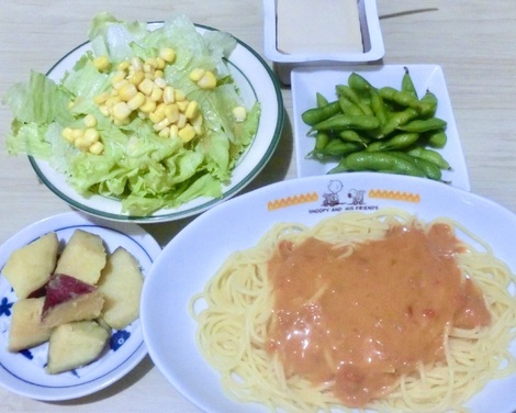 紅ずわい蟹のトマトクリームスパゲティ、さつま芋の煮物、