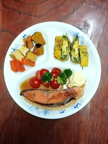 秋鮭のバター焼き、南瓜・人参・厚揚げ煮、玉子焼き、サラダ