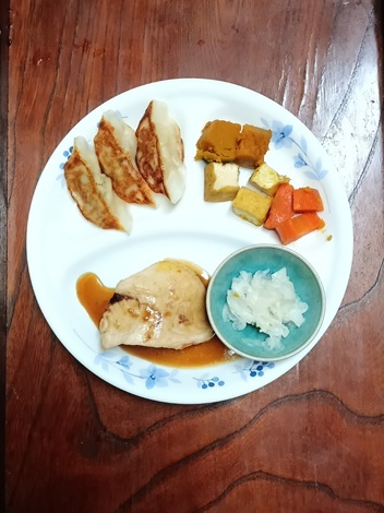 メカジキの煮付け、餃子、南瓜・人参・厚揚げ煮、酢の物