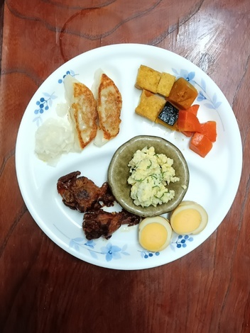 手羽元の甘酢煮、餃子、南瓜・人参・厚揚げ煮、ゆで玉子、サラダ、酢の物