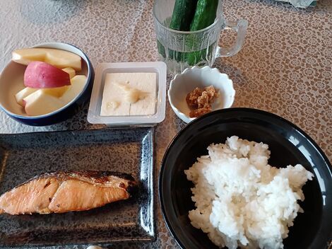 鮭の塩焼・奴豆腐・もろキュウ・リンゴなどです。