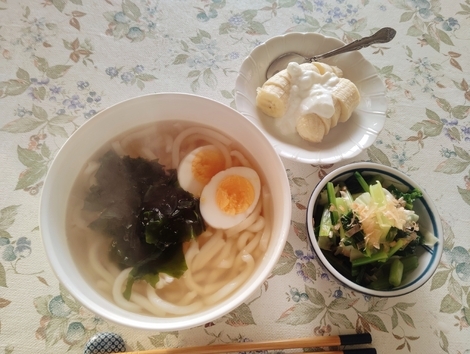 わかめうどん、茹で小松菜、バナナヨーグルト