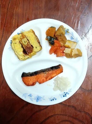 秋鮭の塩焼き、玉子焼き、南瓜・人参・ごぼう巻き・厚揚げ煮、酢の物