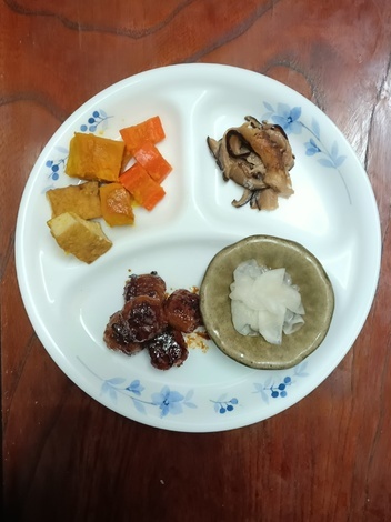 肉団子甘酢炒め、南瓜・人参・厚揚げ煮、椎茸の甘辛煮、酢の物