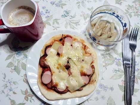 お魚ソーセージのピザ、酢ごぼう、カフェオレ☕️