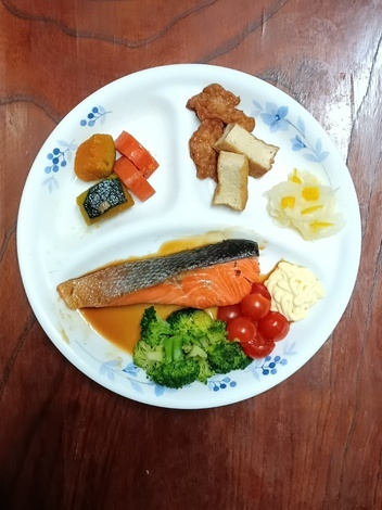 鮭の和風焼き、南瓜・人参・揚げ物煮、サラダ、ゆず大根