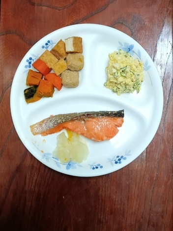 鮭の塩焼き、南瓜・人参・肉団子・厚揚げ煮、サラダ、ゆず大根