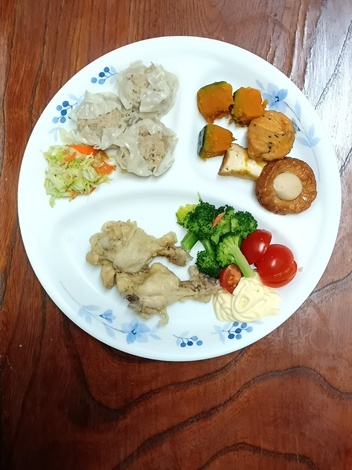 手羽元の甘酢煮、焼売、南瓜・揚げ物煮、サラダ、酢の物