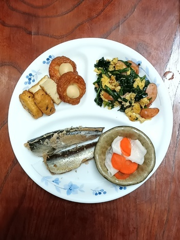鰯の煮付け、揚げ物煮、ほうれん草・ウインナー・玉子炒め、かぶ・人参甘酢漬け