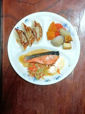 鮭のバター焼き、餃子、南瓜・人参・里芋・厚揚げ煮、酢の物