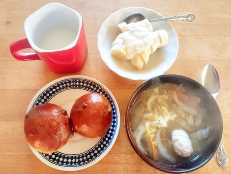 レーズンパン、鶏だんごのスープ、バナナヨーグルト、牛乳