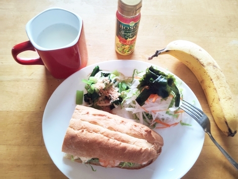 えびサンド、大根サラダ、茹で小松菜、バナナ、ホットミルク