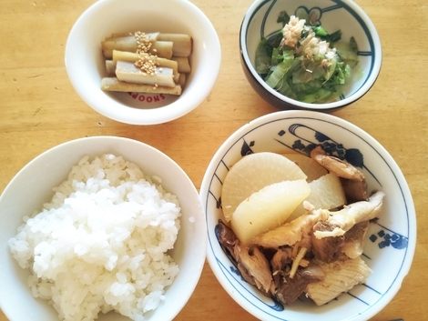 ごはん、ぶり大根、酢ごぼう、茹で小松菜