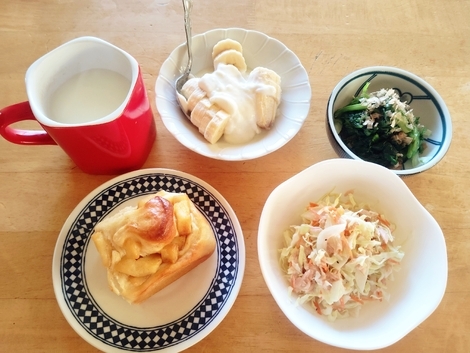 りんごパン、ツナサラダ、茹で小松菜、バナナヨーグルト、ホットミルク