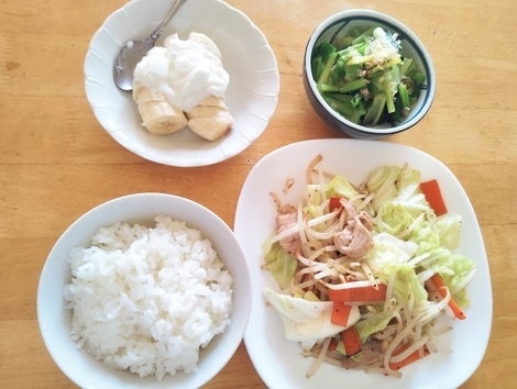 ごはん、野菜炒め、茹で小松菜、バナナヨーグルト