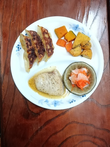 メカジキのバター焼き、餃子、南瓜・人参・揚げ物煮、酢の物