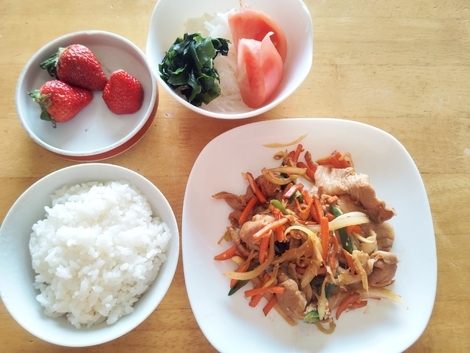 ごはん、豚肉のプルコギ風、大根サラダ、いちご🍓