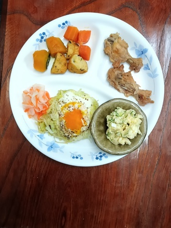 手羽元煮、南瓜・人参・揚げ物煮、巣ごもり玉子、サラダ、酢の物
