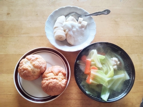 プチフランス、野菜スープ、バナナヨーグルト