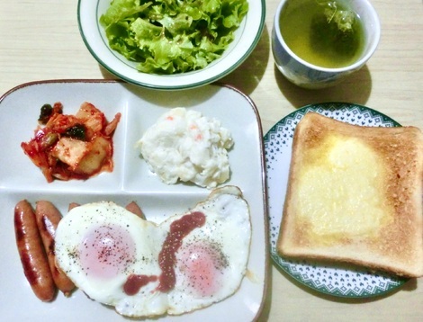 トースト、目玉焼き、ソーセージ、ポテサラ、キムチ、サラダを食べました。