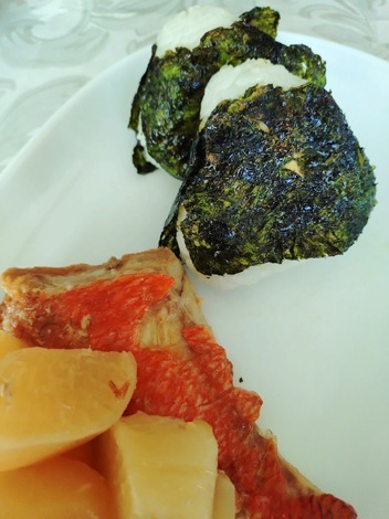 韓国のりのおにぎりとキンメ煮付け残りもの