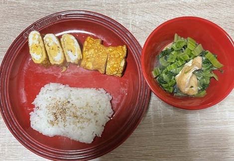 ごはん、だし巻き玉子、かき菜のにびたし