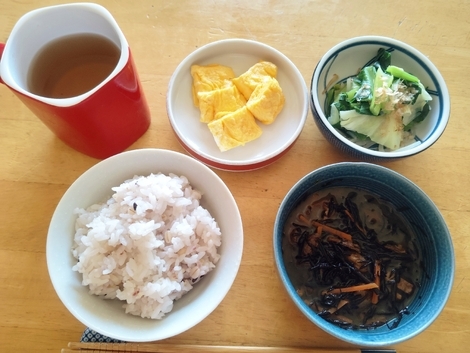雑穀米、ひじきの煮物、卵焼き、ゆで小松菜