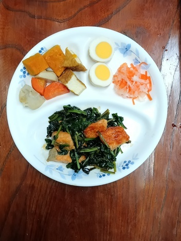 銀鮭・ほうれん草炒め、南瓜・人参・里芋・厚揚げ煮、煮玉子、酢の物