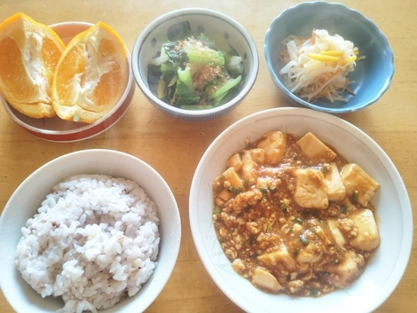 雑穀米、麻婆豆腐、なます、ゆで小松菜、いよかん