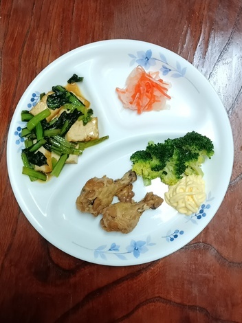 手羽元煮、小松菜・厚揚げのバター炒め、サラダ、酢の物
