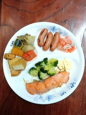 銀鮭の和風焼き、南瓜・根菜・揚げ物煮、ウインナー、サラダ、酢の物