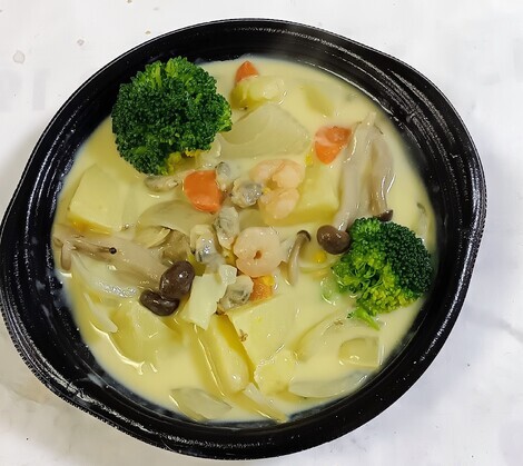 ハムとキャベツの卵焼きとシーフードミックス入りのクリームシチューです。
