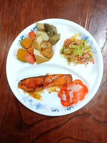 銀鮭の和風焼き、南瓜・根菜・揚げ物煮、コールスロー、酢の物